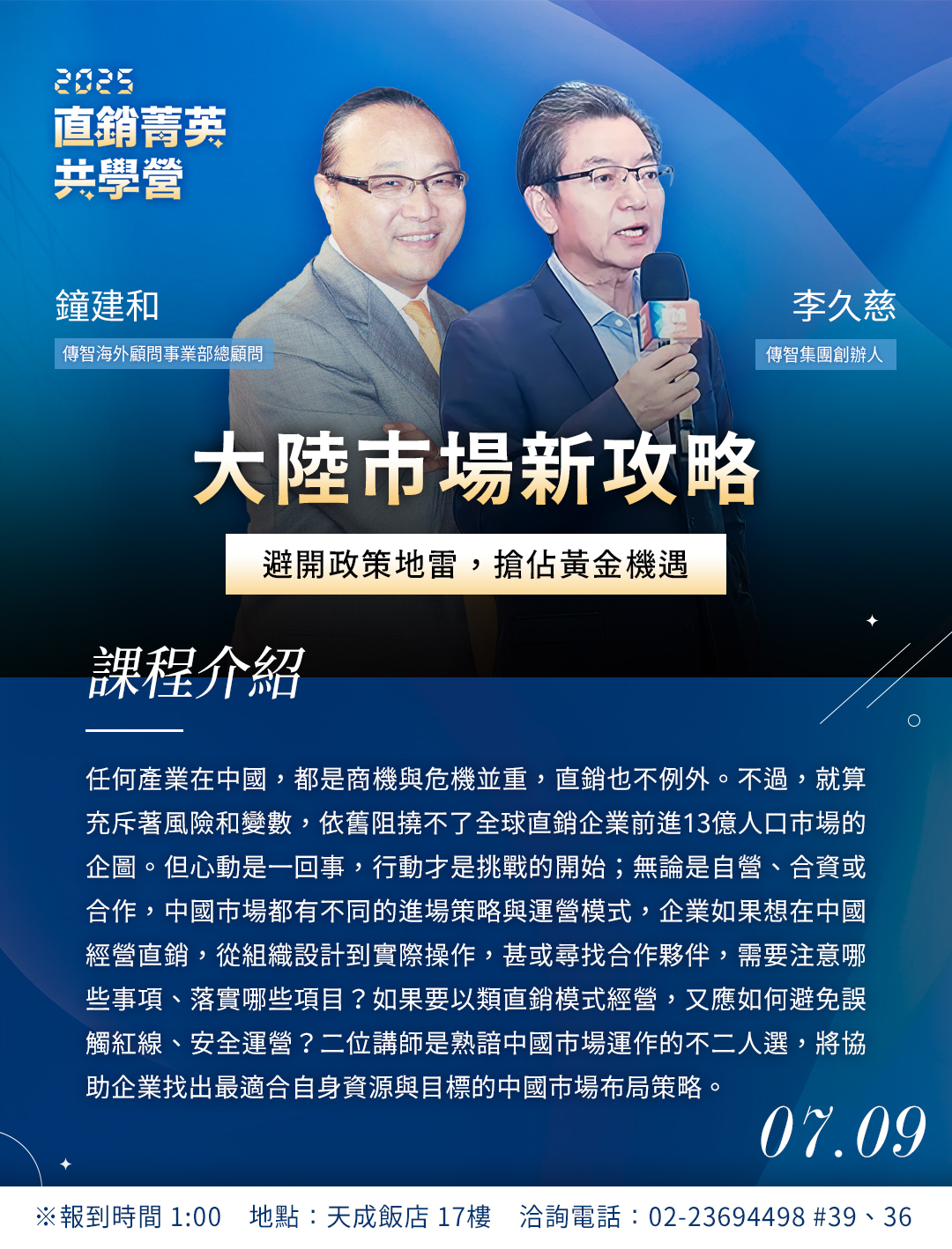 第二場講座李久慈創辦人&鐘建和主講【大陸市場新攻略】