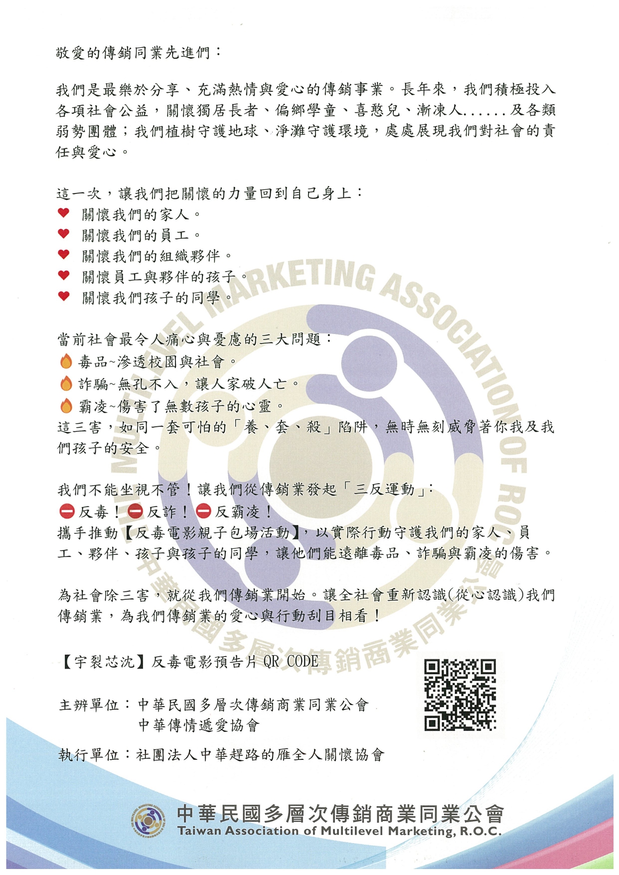 敬愛的傳銷同業先進們: 我們是最樂於分享、充滿熱情與愛心的傳銷事業。 長年來,我們積極投入各項社會公益,關懷獨居長者、偏鄉學童、喜憨兒、漸凍人......及各類弱勢團體;我們植樹守護地球、淨灘守護環境,處處展現我們對社會的責任與愛心。 這一次,讓我們把關懷的力量回到自己身上: 關懷我們的家人。 關懷我們的員工。 關懷我們的組織夥伴。 關懷員工與夥伴的孩子。 關懷我們孩子的同學。 當前社會最令人痛心與憂慮的三大問題: 🔥毒品~滲透校園與社會。 🔥詐騙~無孔不入,讓人家破人亡。 🔥霸凌~傷害了無數孩子的心靈。 這三害,如同一套可怕的「養、套、殺」陷阱,無時無刻威脅著你我及我們孩子的安全。 我們不能坐視不管!讓我們從傳銷業發起「三反運動」: ⛔️反毒!⛔️反詐!⛔️反霸凌! 攜手推動【反毒電影親子包場活動】,以實際行動守護我們的家人、員工、夥伴、孩子與孩子的同學,讓他們能遠離毒品、詐騙與霸凌的傷害。 為社會除三害,就從我們傳銷業開始。讓全社會重新認識(從心認識)我們傳銷業,為我們傳銷業的愛心與行動刮目相看! 【宇裂芯沈】反毒電影預告片 https://youtu.be/ZBY5ZEEyXAY?si=mTYSxG7mRAVOfFfI 主辨單位:中華民國多層次傳銷商業同業公會 中華傳情遞愛協會 執行單位:社團法人中華趕路的雁全人關懷協會