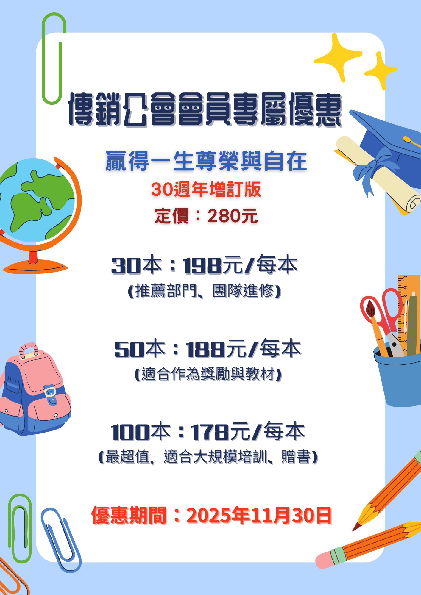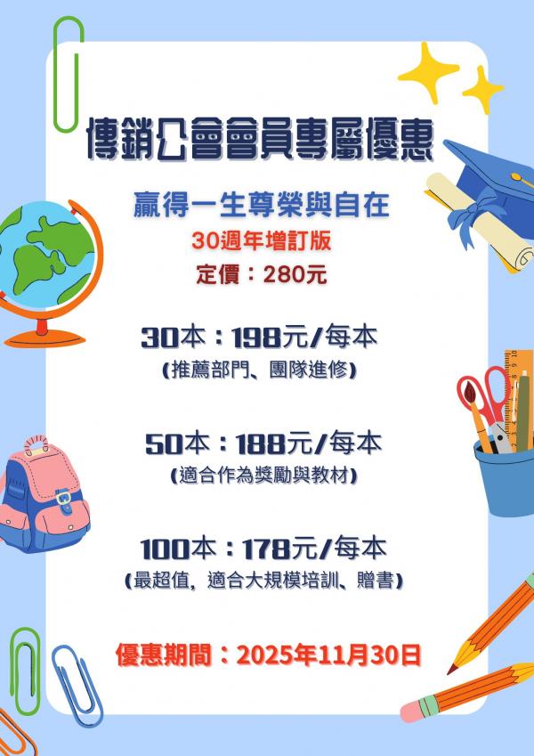 各位會員先進們: 【贏得一生尊榮與自在】是ㄧ本專談傳銷核心價值,強調身教與言教的暢銷書。 今年更推出了"30週年增訂版",非常適合傳銷專經理人,體系領導人,傳銷組織夥伴閱讀。 傳銷公會特商請直銷世紀給予本會全體會員專屬優惠訂購方案,歡迎洽詢訂購。 訂購專線: 直銷世紀黃小姐 (02)2368-4498 分機#39 (摘錄自全美葉總30週年增訂版的推薦序)