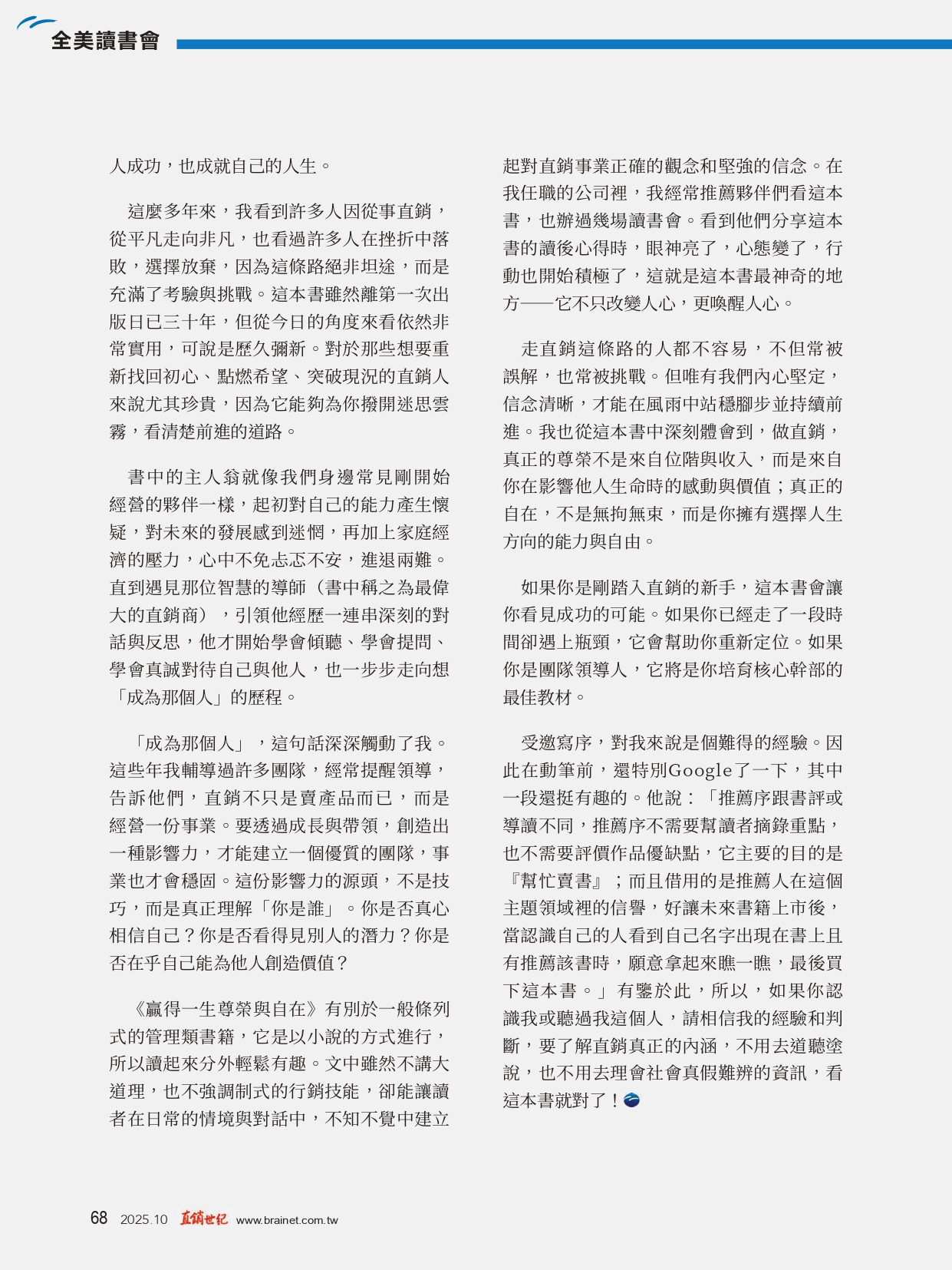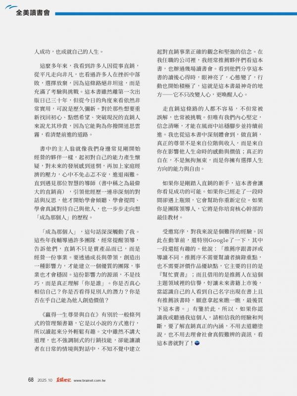 這本書雖然離出版日已30年,但從今日的角度來看依然非常實用,可說是歷久彌新·對於那些想要重新找回初心,點燃希望,突破現況的直銷人來說尤其珍貴,因為它能夠為你撥開迷思雲霧,看清楚前進的道路。