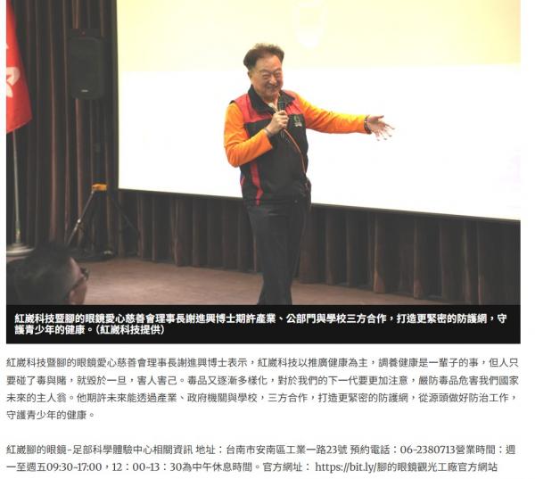 紅崴科技十七日特與社團法人中華趕路的雁全人關懷協會、中華民國多層次傳銷商業同業公會與台南市青年杏林醫學教育協會聯手推動反毒教育,在紅崴科技總部舉辦「反毒宣傳公益活動」,北中南的民眾共同參與這場盛會,透過觀賞以色列3D電影、真實事件改編的本土電影《宇裂芯沉》與識別仿真毒品、有獎徵答等活動、以提升社會大眾識毒、拒毒的意識。 新興毒品越發越氾濫,吸毒人口更逐漸年輕化,造成許多社會問題,紅崴科技特別邀請趕路的雁全人關懷協會理事長廖秋欽、執行經理周宜賢所帶領的團隊,前往紅崴科技總部進行宣導。活動開始前,紅崴科技發下宣誓小卡,期待參與者們在經歷這場公益活動後能夠將自己的感想與期盼寫下,也為正在努力戒毒的人們加油打氣,成為反毒家園防護網的一環。 紅崴科技暨腳的眼鏡愛心慈善會理事長謝進興博士表示,紅崴科技以推廣健康為主,調養健康是一輩子的事,但人只要碰了毒與賭,就毀於一旦,害人害己。毒品又逐漸多樣化,對於我們的下一代要更加注意,嚴防毒品危害我們國家未來的主人翁。他期許未來能透過產業、政府機關與學校,三方合作,打造更緊密的防護網,從源頭做好防治工作,守護青少年的健康。 https://www.cdns.com.tw/articles/1349258