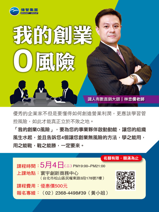 「我的創業0風險」,要為您的事業夥伴啟動動能,讓您的組織風生水起,並且告訴您4個讓您創業無風險的方法,學之能用,用之能戰,戰之能勝,一定要來。