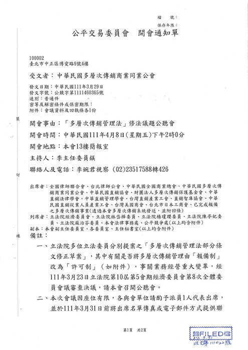 (一)立法院多位立法委員分別提案之「多層次傳銷管理法部分條文修正草案」,其中有關是否將多層次傳銷管理由「報備制」改為「許可制」(如附件),事關業務經營重大變革,經111年3月23日立法院第10屆第5會期經濟委員會第8次全體委員會議審查決議召開公聽會。