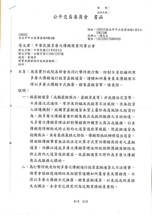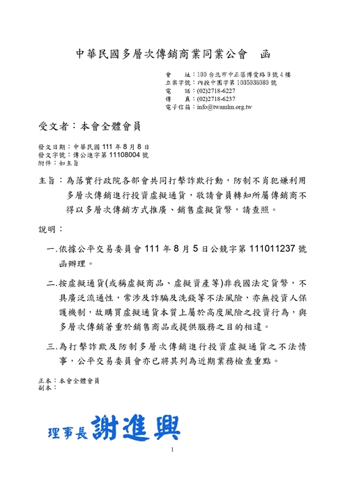 主旨:為落實行政院各部會共同打擊詐欺行動,防制不肖犯嫌利用多層次傳銷進行投資虛擬通貨,敬請會員轉知所屬傳銷商不得以多層次傳銷方式推廣、銷售虛擬貨幣,請查照。