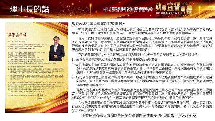 2023年謝進興理事長深獲眾望連任理事長,將引領第四屆全體理監事繼續努力,公會一步一腳印取得了許多重要的成就,公會未來的願景和承諾,將傳銷大環境朝向禁止不正派經營的投機份子混淆其中,不正派經營業者將被嚴格取締,並要求政府負起該有的監管責任,負起對傳銷產業興利除弊的政府天職,以實現我們的共同目標。