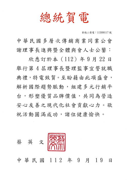 欣聞訂於本(112)年9月22日舉行第4屆理事長暨理監事宣誓就職典禮,特電申賀。