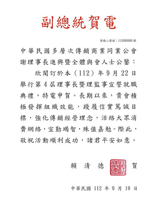 副總統賴清德祝賀「中華民國多層次傳銷商業同業公會第四屆理事長暨理監事宣誓就職典禮」影片