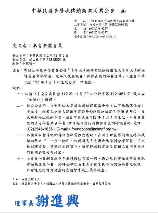 二、該公告表示,自財團法人多層次傳銷保護基金會(以下簡稱傳保會)成立後,報備之多層次傳銷事業於符合連缴納法定年費滿9年者,自次年起停止繳納年中費,並自中華民國113年1月1日生效。本會會員缴納法定年費滿9年者,即日起可自行向傳保會查詢確認資格,電話:(02)2546-1636,E-mail:foundation@mlmpf.org.tw。