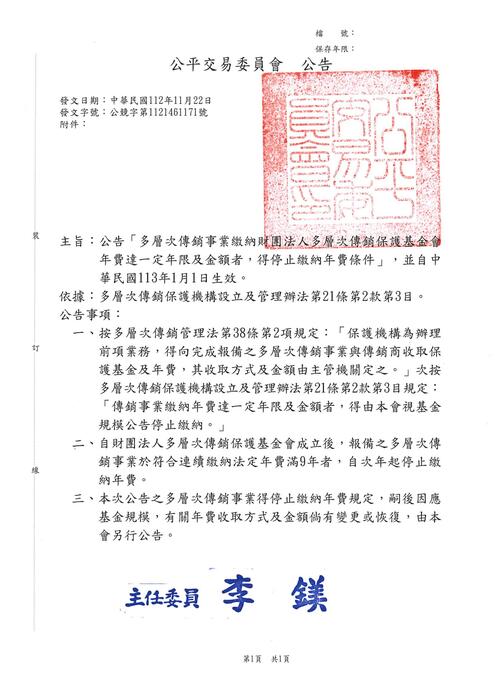 主旨:有關公平交易委員會公告「多層次傳銷事業繳納財團法人多層次傳銷保護基金會年費達一定年限及金額者,得停止繳納年費條件」,並自中華民國113年1月1日生效乙案,請查照。