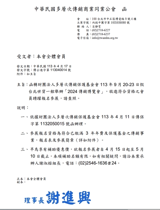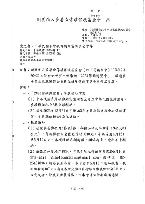 主旨:函轉財團法人多層次傳銷保護基金會113年9月20-23日假台北世貿一館舉辦「2024傳銷博覽會」,敬邀符合資格之會員踴躍報名參展,請查照。