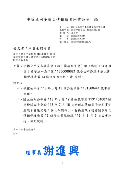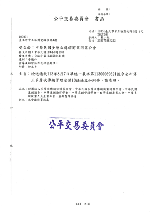 二、隨文檢附公平會113年8月12日公競字第1131461007號函檢送公平會於113年7月15日辦理之傳銷電子契約事宜座談會會議紀錄1份(如附件),旨揭座談會後有關多層次傳銷管理法第 13 條條文業經總統113 年 8 月 7 日公布施行,併此說明。