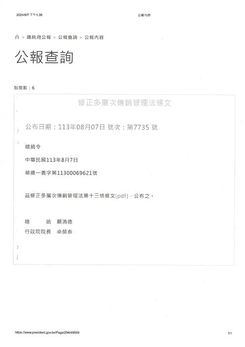 多層次傳銷管理法第13條電子契約條文修正業經總統令113年8月7日華總一義字第11300069621 號公告施行!
