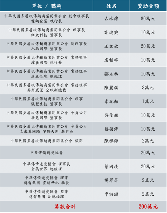 此贊助專案由本會葉國淡理事長與廖秋欽常務監事向公會理監事會報告共同募款,古承濬創會理事長、謝進興理事長、王文欽副理事長及理監事們熱烈響應,與趕路的雁協會廖秋欽理事長、李執行長、周經理及林導演研議後有以下結論: