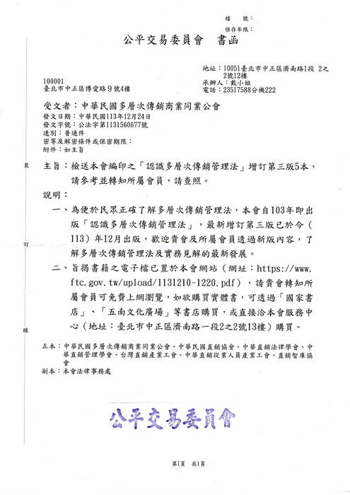 說明: 一、為便於民眾正確了解多層次傳銷管理法,本會自103年即出版「認識多層次傳銷管理法」,最新增訂第三版已於今(113)年12月出版,歡迎貴會及所屬會員透過新版內容,了解多層次傳銷管理法及實務見解的最新發展。