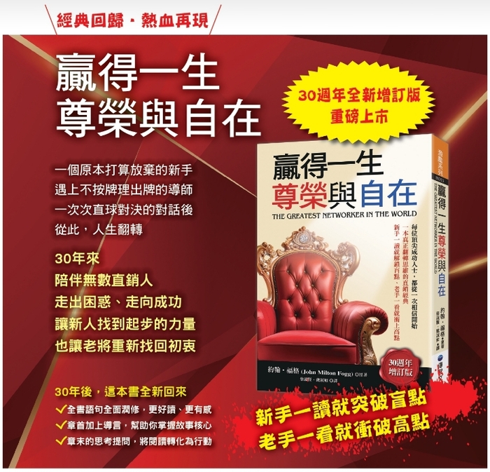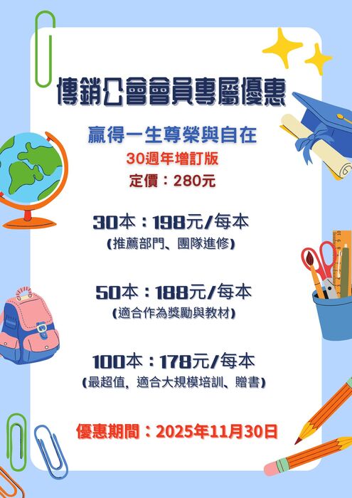 今年更推出了"30週年增訂版",非常適合傳銷專經理人,體系領導人,傳銷組織夥伴閱讀。 傳銷公會特商請直銷世紀給予本會全體會員專屬優惠訂購方案,歡迎洽詢訂購。