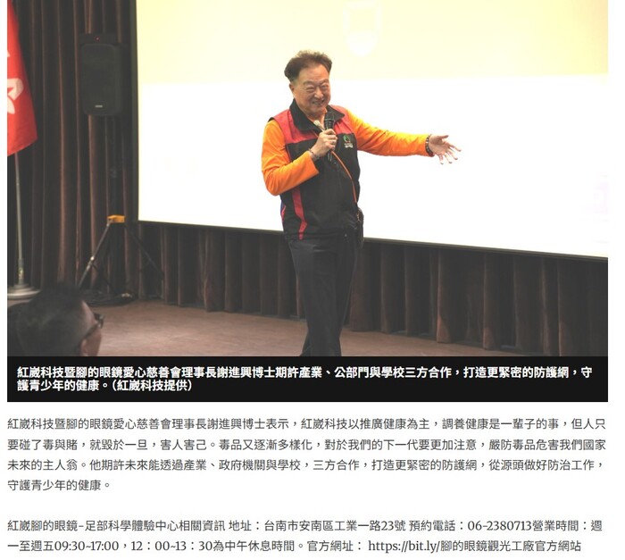 紅崴科技暨腳的眼鏡愛心慈善會理事長謝進興博士表示,紅崴科技以推廣健康為主,調養健康是一輩子的事,但人只要碰了毒與賭,就毀於一旦,害人害己。毒品又逐漸多樣化,對於我們的下一代要更加注意,嚴防毒品危害我們國家未來的主人翁。他期許未來能透過產業、政府機關與學校,三方合作,打造更緊密的防護網,從源頭做好防治工作,守護青少年的健康。