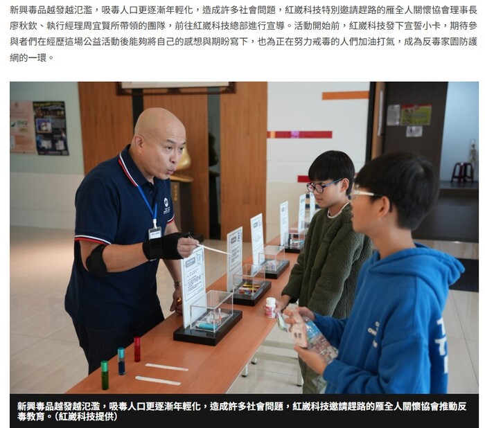 新興毒品越發越氾濫,吸毒人口更逐漸年輕化,造成許多社會問題,紅崴科技特別邀請趕路的雁全人關懷協會理事長廖秋欽、執行經理周宜賢所帶領的團隊,前往紅崴科技總部進行宣導。活動開始前,紅崴科技發下宣誓小卡,期待參與者們在經歷這場公益活動後能夠將自己的感想與期盼寫下,也為正在努力戒毒的人們加油打氣,成為反毒家園防護網的一環。